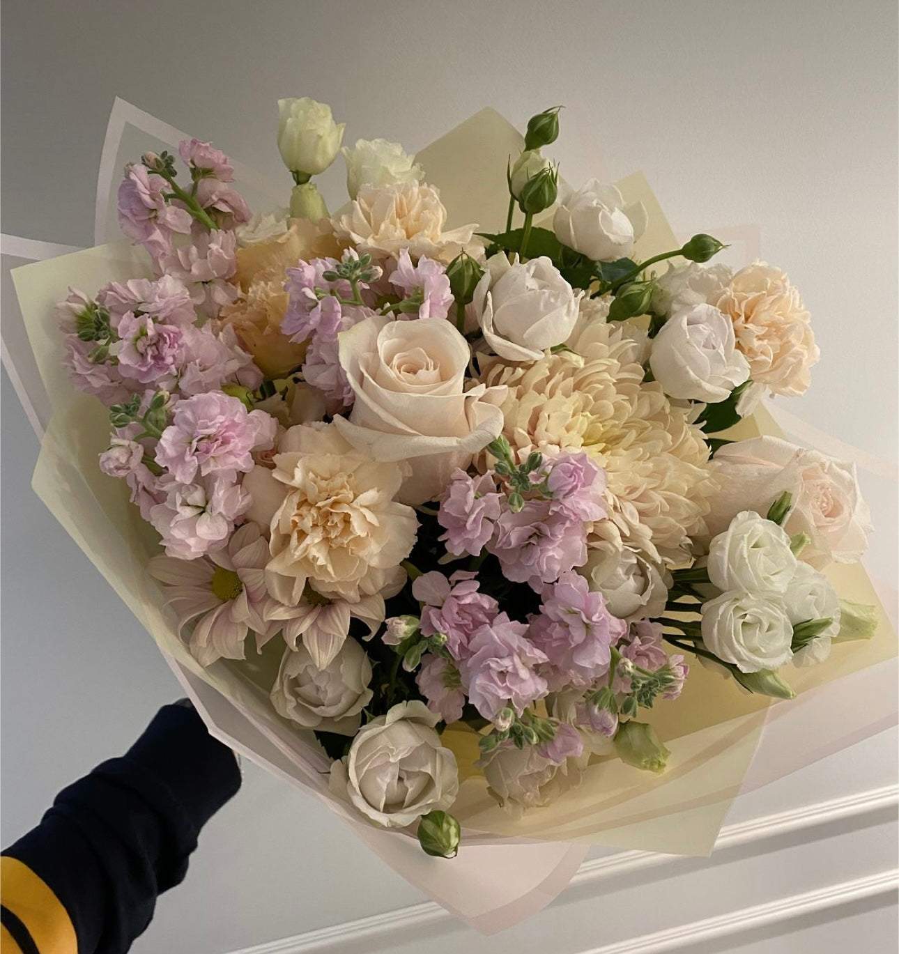 This bouquet is a beautiful mix of flowers with soft, delicate colors. It includes creamy white roses and mum, which are known for their full, rounded blooms. The bouquet also features light pink stock flowers, adding height and a lovely scent.