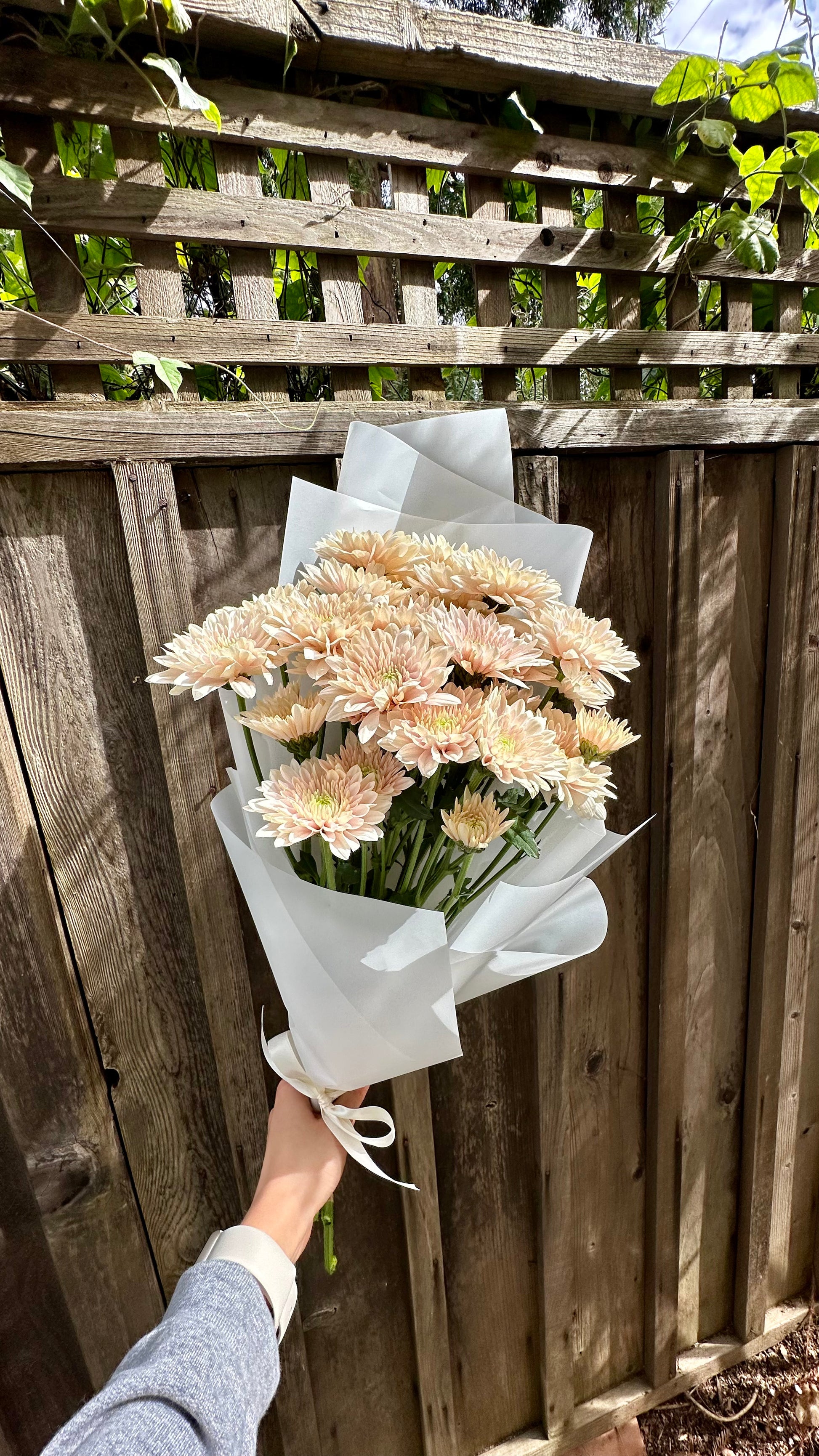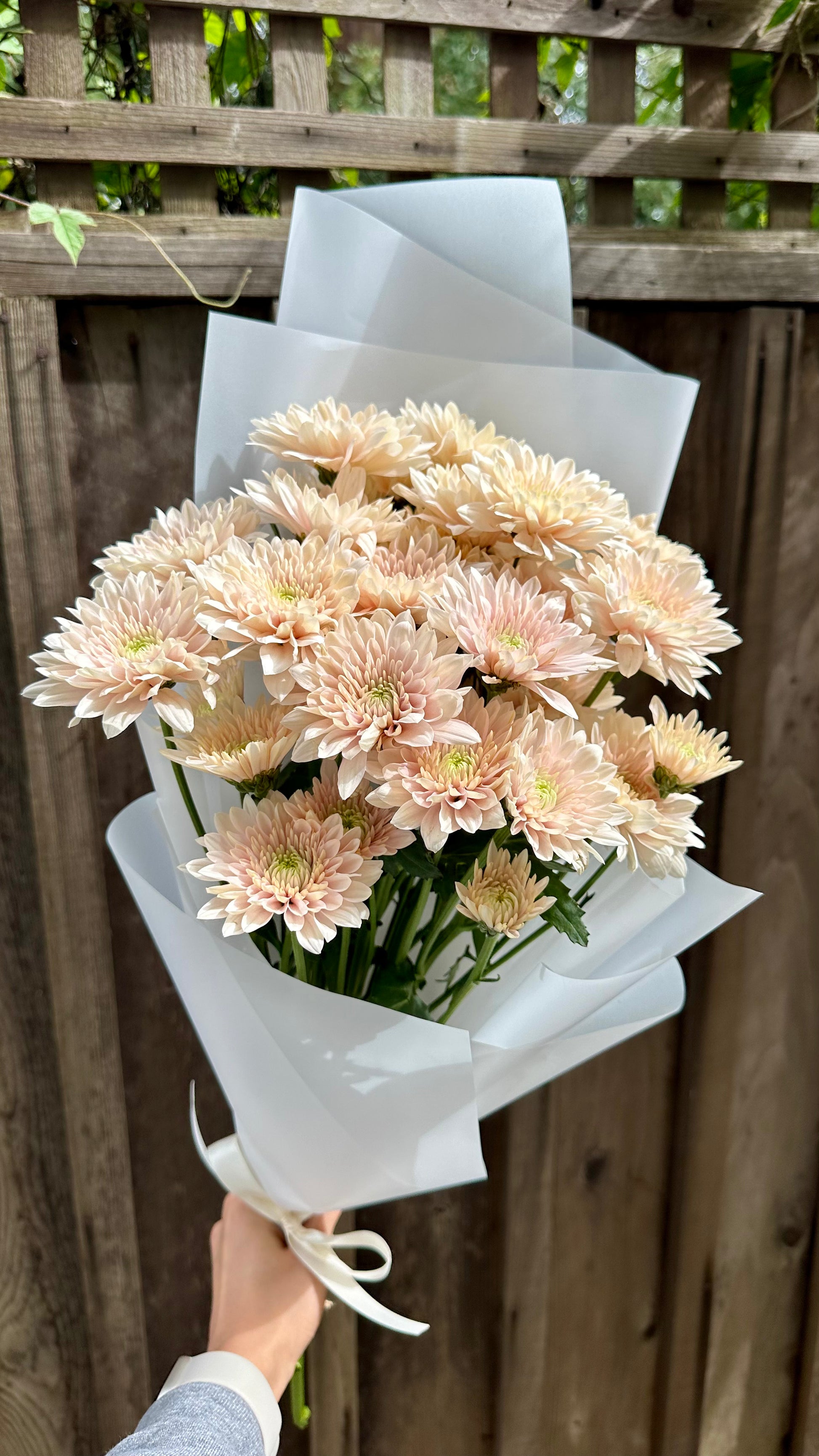 This bouquet features an array of pale peachy-pink chrysanthemums, each bloom radiating with delicate, layered petals that convey a sense of warmth and joy. Wrapped in a chic white paper and secured with a soft ribbon, the bouquet is a testament to understated elegance, perfect for gifting on special occasions or adding a touch of natural beauty to any space.