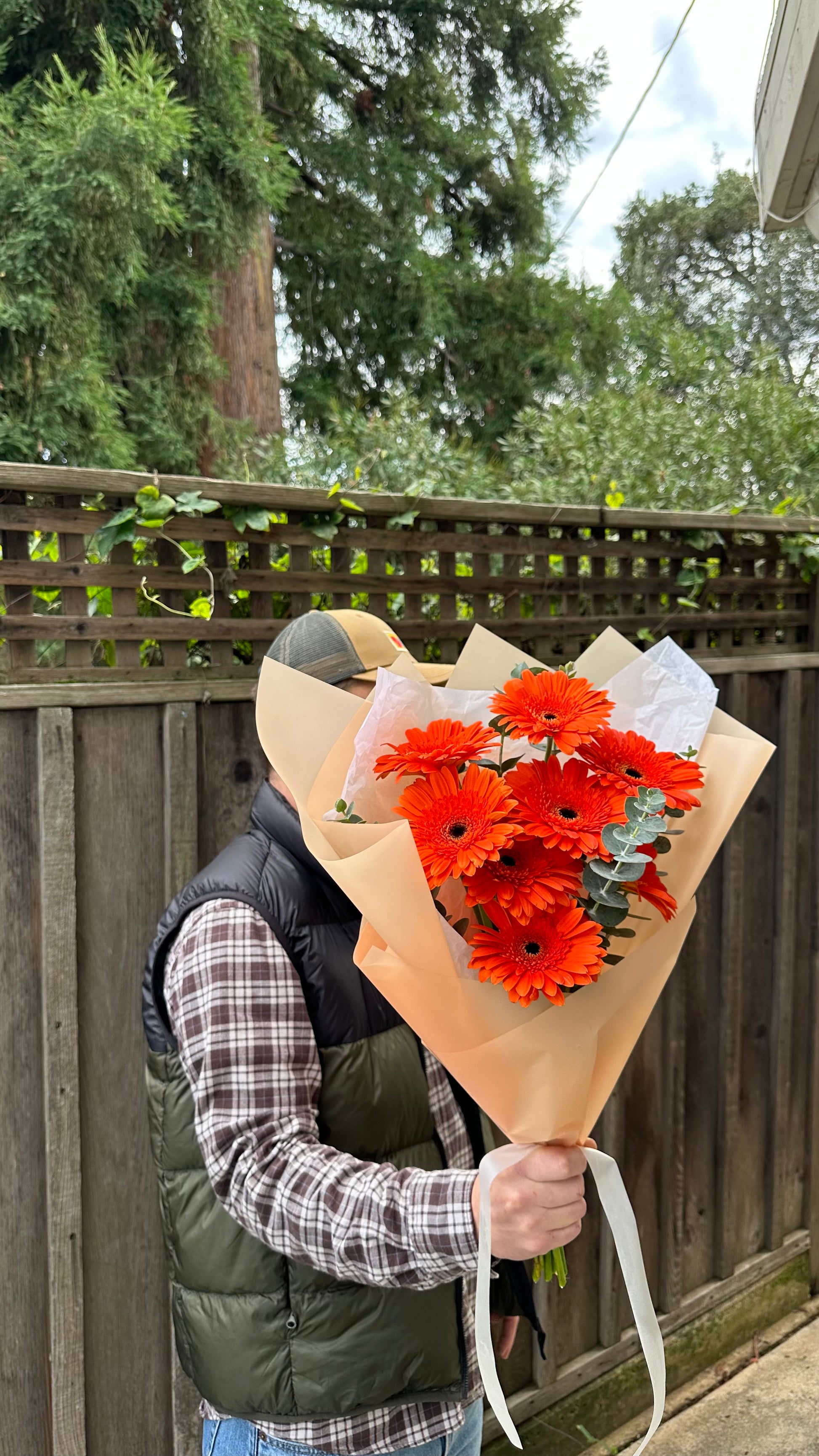 Embrace the warmth of a sun-kissed morning with this vibrant bouquet of orange gerberas. Each blossom is a burst of joy, reminiscent of summer's glow, and is tenderly cradled in a wrapping of peach and cream, hinting at the softness of a dream. Accents of silvery-green eucalyptus leaves peek through, offering a refreshing contrast and a hint of calm. This bouquet is not just a visual feast but an expression of happiness and enthusiasm, making it a perfect gift to brighten someone's day or to add a touch of cheer to your own space.