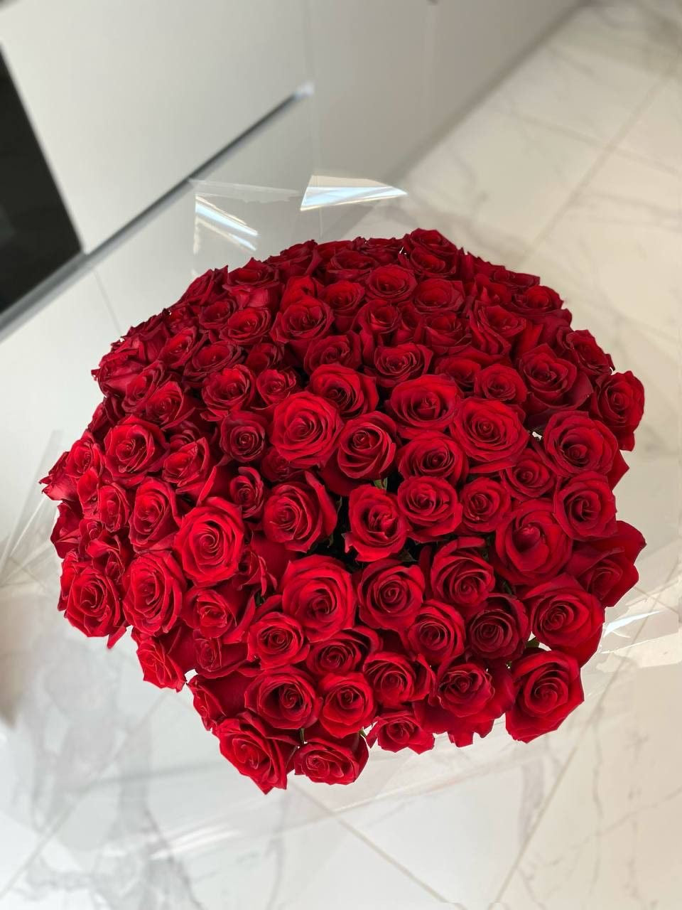 Envision a dome of passion, a dense cluster of velvety roses in the deepest shades of love. This bouquet is a sea of crimson, each petal softly unfurling like the curtains on a stage of romance. It's a classic expression of affection, where the abundance of blooms speaks of a generosity of spirit and a rich, enduring love. This luxurious gathering of roses is poised to turn any moment into a memorable occasion, breathing life into anniversaries, celebrations, or simply to say, "You are cherished."