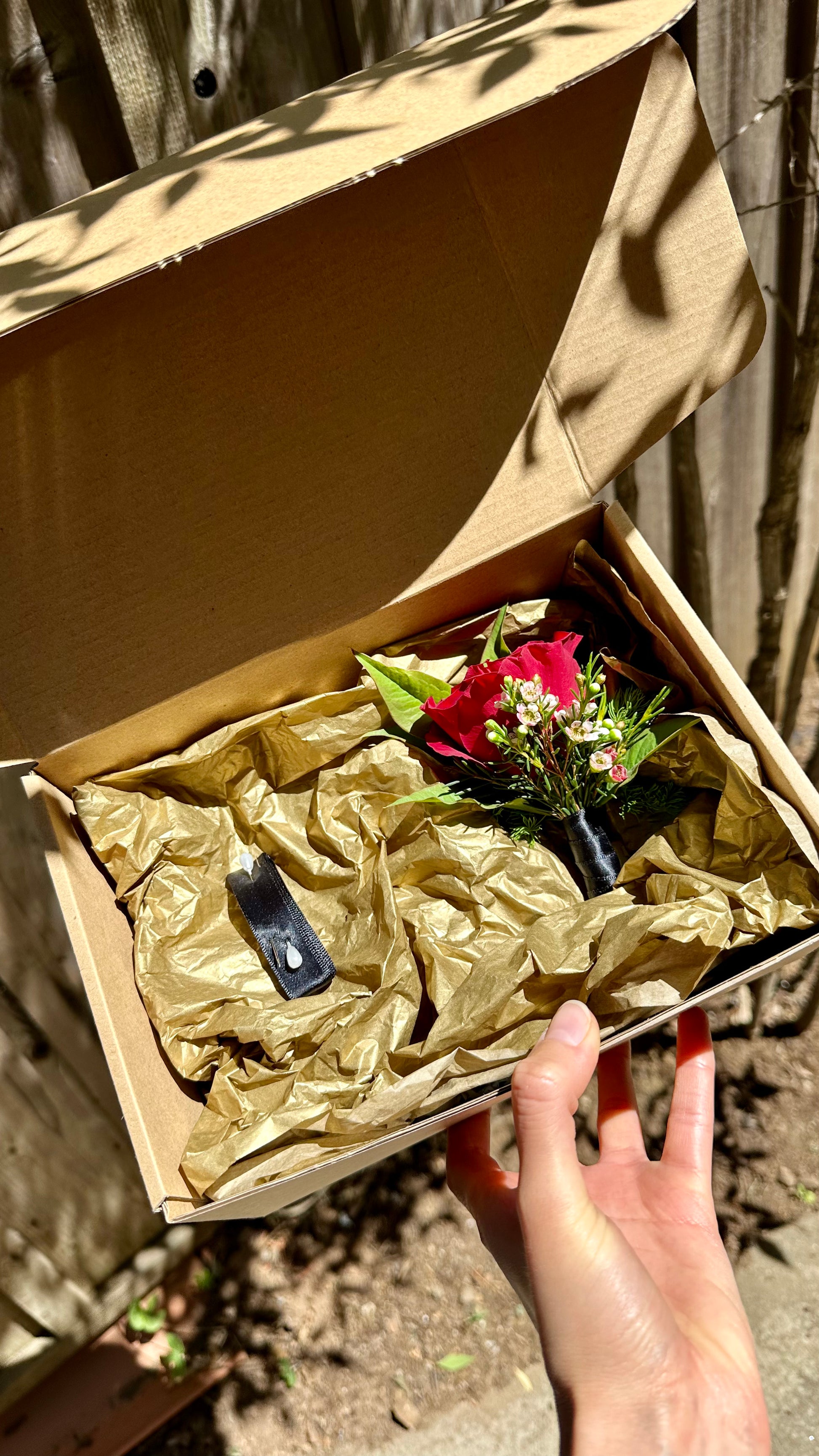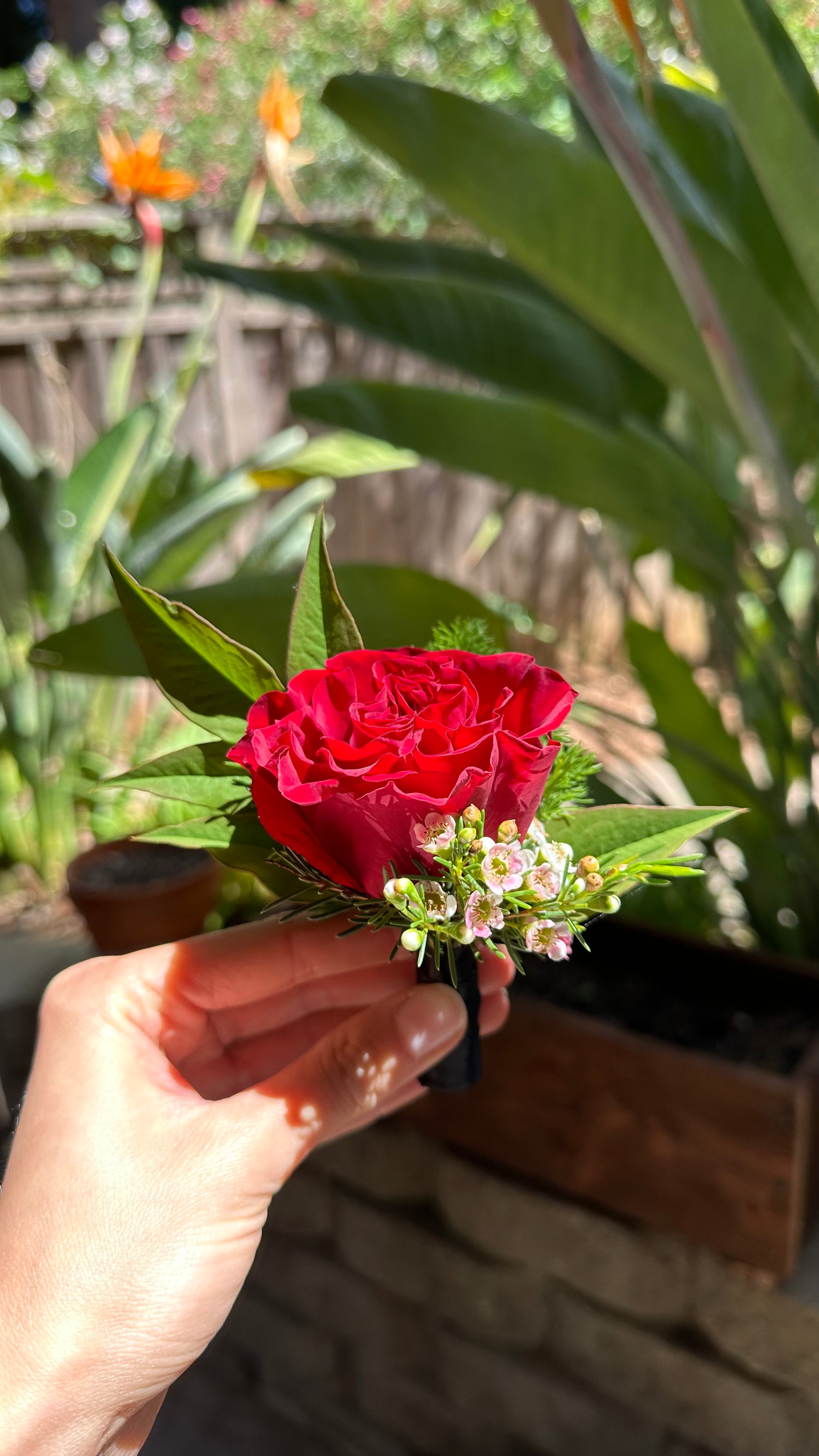 "Scarlet Romance" boutonniere, a classic and elegant accessory perfect for any special occasion. This stunning piece features a single, velvety red rose, symbolizing deep love and passion. The rose is beautifully complemented by delicate sprigs of wax flowers, adding a touch of dainty charm, and surrounded by lush, green foliage for a fresh and vibrant look. Expertly arranged and easy to pin, the "Scarlet Romance" boutonniere is ideal for weddings, proms, or any event where you want to add a dash of timeless sophistication.