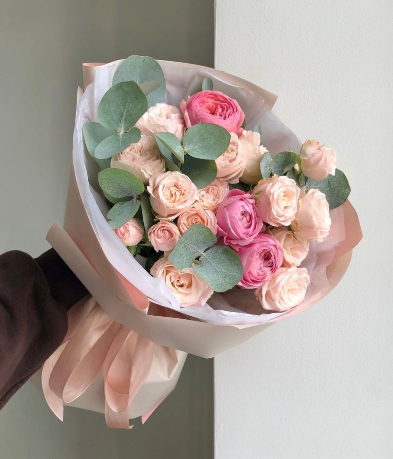 This bouquet presents a delicate harmony of blush and soft pink roses, beautifully wrapped in a graceful pale pink paper that enhances the bouquet’s romantic allure. The blooms are thoughtfully interspersed with hints of silvery-green eucalyptus leaves, adding a touch of organic elegance. This arrangement speaks of gentle affections and tender moments, perfect for occasions that call for a whisper of sweetness and heartfelt emotions.