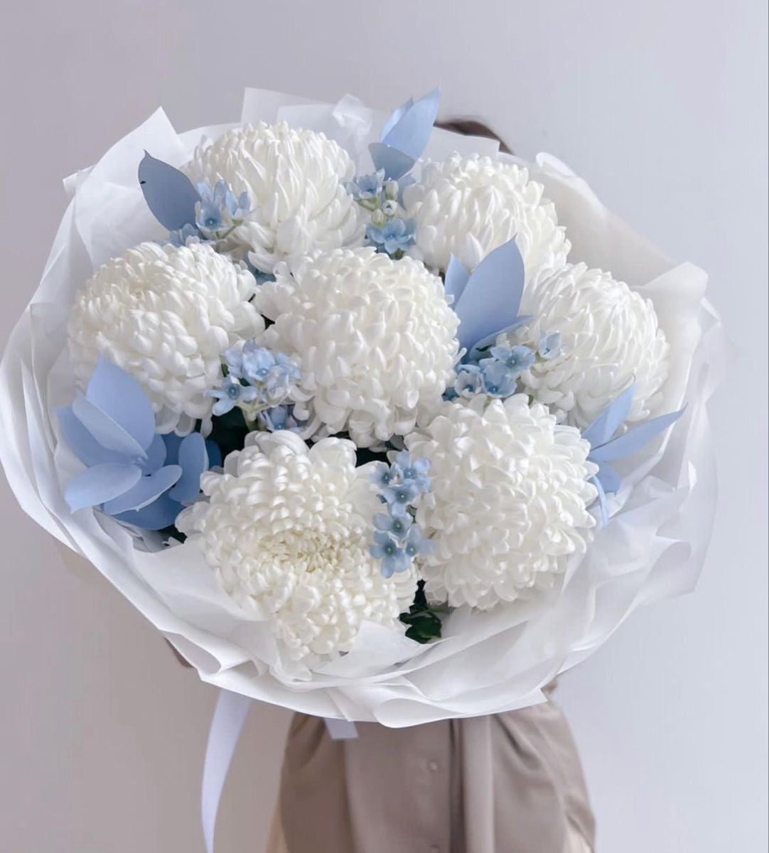 This bouquet, aptly titled "White Clouds," seems to float with an ethereal grace, reminiscent of a clear sky punctuated by soft, fluffy clouds. It features an array of plush white chrysanthemums, each bloom standing out with its densely packed petals that seem to swirl like the gentle eddies of cloud formations. These are subtly accented with hints of pale blue flowers, evoking the rare, serene beauty of a cloud-dappled sky.